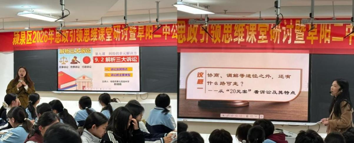 活动中,两位授课老师紧扣高中思想政治选择性必修二《法律与生活》“解析三大诉讼”这一主题,从不同教学视角出发,呈现了两节各具特色的公开课。阜阳七中靳倩楠老师借助AI技术,以“獬豸的困惑”为主线,创设贴近学生生活的情境,引导学生在体验与探究中理解诉讼的内涵与特点,辩析三大诉讼类型;阜阳二中黄传利老师则以“徐州东站20元索赔案”这一真实案例为载体,一案到底开展议题式教学,通过案件梳理、类型对比、课堂辩论等多元活动,带领学生循序渐进地掌握相关知识。