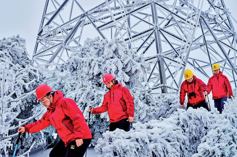 2024年2月,浙江迎来新一轮低温雨雪天气,位于绍兴山区的500千伏凤岩、凤苍等多条供电线路出现不同程度的覆冰情况。为保障当地供电线路的安全稳定运行,截至2月26日,国网绍兴供电公司共出动红船共产党员服务队18支,顺利完成了9条覆冰线路直流融冰工作和配电网抢修工作。图为2月26日,红船共产党员服务队队员对500千伏凤岩5832线71号塔-72号塔覆冰严重区段开展特巡工作。 新华社记者 金良快/摄
