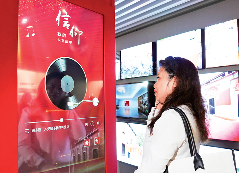 2023年9月11日,“永恒的誓言——中国共产党入党宣誓文物史料专题展”开幕式在中共一大纪念馆举行。展览展出文物史料270件(套),引领观众在入党誓词的发展演变中领会中国共产党人的初心和使命,从践行誓言的典范中感悟铮铮誓言中的思想内涵与精神力量。图为当日,参观者通过多媒体装置聆听普通党员讲述自己的入党故事。 新华社记者 刘颖/摄
