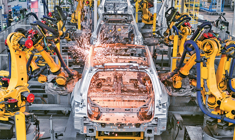 加快发展新质生产力,要推动数字技术在先进制造业中的应用扩散,形成两者之间相互支撑、相互促进的良性循环。图为2024年1月10日,在理想汽车常州基地车间,机械手臂在进行焊接作业。 新华社记者 季春鹏/摄