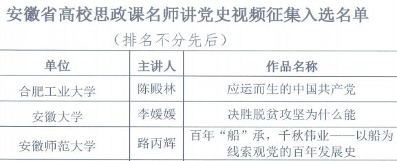 此次“思政课名师讲党史”视频征集活动是安徽省高校思政课教指委在省委教育工委、省教育厅思政处的指导下,面向安徽全省高校开展的庆祝建党100周年主题宣传教育活动的重要内容。经评审,全省高校共30个视频入选,安徽省高校思政课教指委将对入选的思政课名师颁发证书,入选视频将在安徽省智慧思政课教学平台展示,同时比照二类教研项目予以对待。