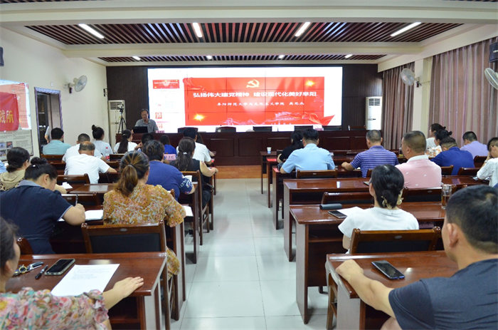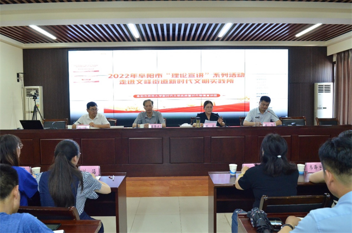 7月12日下午,在阜阳市文明办、颍州区文明办的共同组织下,阜阳市新时代文明实践学院理论宣讲团走进阜阳市颍州区文峰街道,开展首场理论宣讲活动。阜阳师范大学马克思主义学院党委书记高思杰带领6名师生做宣讲报告,阜阳市文明办副主任张燕,颍州区委宣传部副部长、区文明办主任刘振参加活动,颍州区文峰街道党工委书记曾亮主持活动,文峰街道近百名党员参加活动。