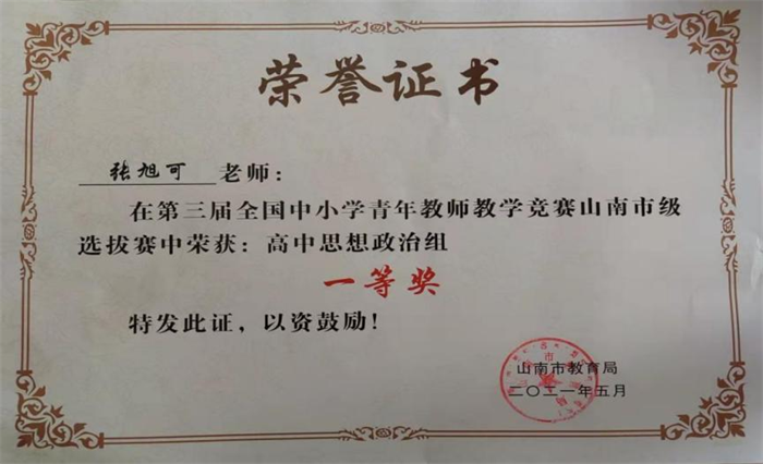 盛开的鲜花,凝聚挚爱的心血,平凡的事业,展示不平凡的人格。一直以来兢兢业业的张旭可,将全部精力投入到思政课教学中,致力于西藏地区的教育事业,她的坚持与意志终换来了荣誉与勋章。张旭可同学现在是山南完全中学初高中部政治学科教研组组长,在2021年5月举办的全国中小学青年教师教学竞赛山南市选拔赛中,张旭可凭借过硬的教学本领荣获得一等奖。高二下学期过半接班担任班主任,用半个学期时间让重点班学生成绩从全校倒数第三提升到全学校前列并一起保持。此外,张旭可还加入山南市思政名师工作室,开展课题研究,积极发挥引领、辐射作用,做好思政课实践教学示范工作。