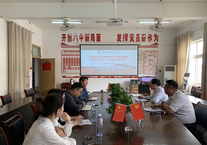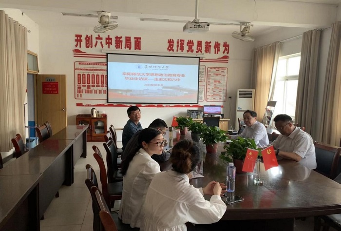 为深入推进我院思想政治教育专业认证工作,了解思政专业毕业生就业状况,进一步加强毕业生与母校之间的交流与联系,2023年5月31日,院长闫成俭、思想政治教育系主任李强、青年教师何纪祥一行3人前往太和县第六中学开展毕业生访谈活动,思想政治教育专业1990届优秀校友——太和县第六中学校长刘勋、2007届优秀校友——太和县第六中学一级教师车丽等参加座谈。