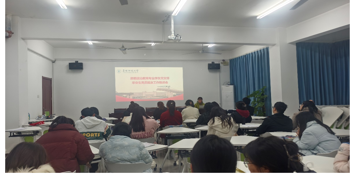 随后,党支部召开了毕业生党员就业工作推进会。本次会议旨在为毕业生党员高质量就业凝聚合力、提振信心。同时也鼓励非毕业生党员提前做好就业规划,在社会实践中奋力锤炼专业技能,提升专业素养。会上,宁焱结合当前就业形势与专业特点,强调“就业是检验党员担当的实践考场”,号召毕业生党员以“赶考”心态,积极投身基层教育一线,以扎实行动践行思政人的使命担当。支部委员张涛分享了目前毕业生成功的就业案例,激励大家坚定信心,积极寻找适合自己的就业岗位并对典型的就业问题给予针对性的就业指导。