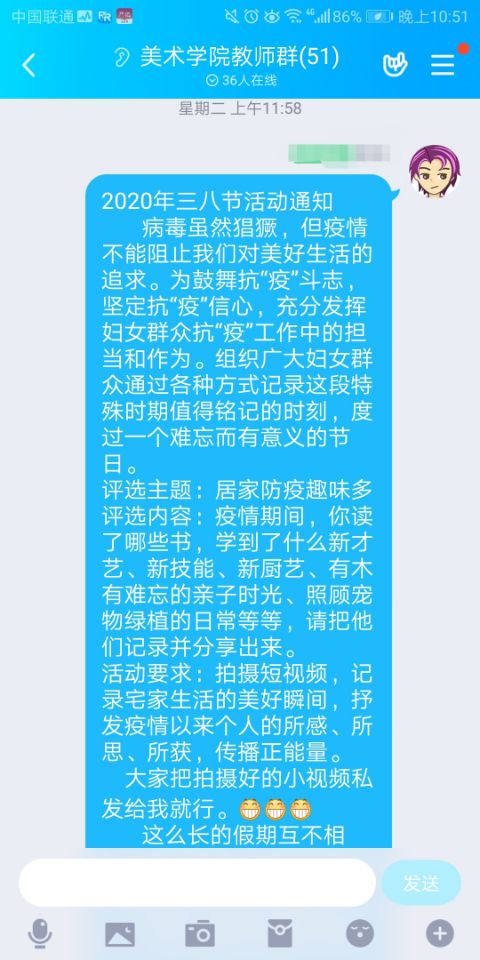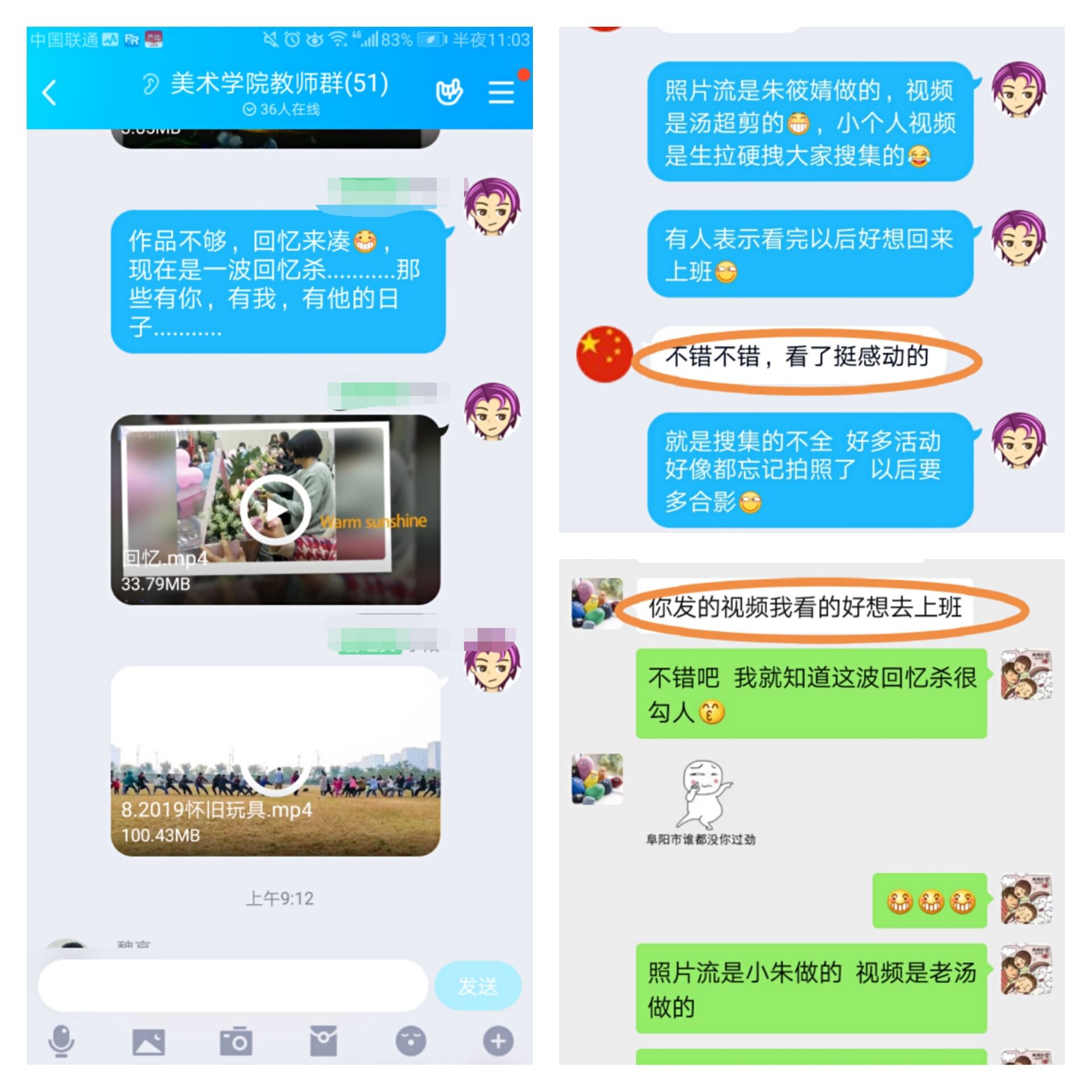 活动于3月3日发起倡议,动员教职工以小视频或照片流的形式,记录宅家生活的美好瞬间,抒发疫情以来个人的所感、所思、所获。节日当天,先是在美院教师QQ群里将前期征集到的视频短片分为滋补美食、全面发展、尊老爱幼、以艺战疫四个类别集中推送,再将事先剪辑好的近年来学院集体活动照片流和视频集锦上传,让大家重温美院大家庭的美好和温馨。隔离病毒,不隔离爱,老师们在观看完这些集体活动老照片、短视频后,纷纷表示倍受感动,发出“看完好想回去上班”的感慨。