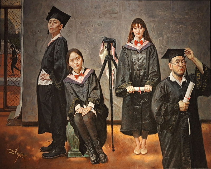 程瑞作品《毕业生》(油画)创作题材源于现实生活,生动表现了当代大学毕业生的精神面貌。画面所表现的人物形象带有作者一定的情志寄托和思想隐喻,主体人物造型经过作者艺术归纳、整理之后,散发出自信、阳光的青春气息,充分展现了艺术造型的感染力。