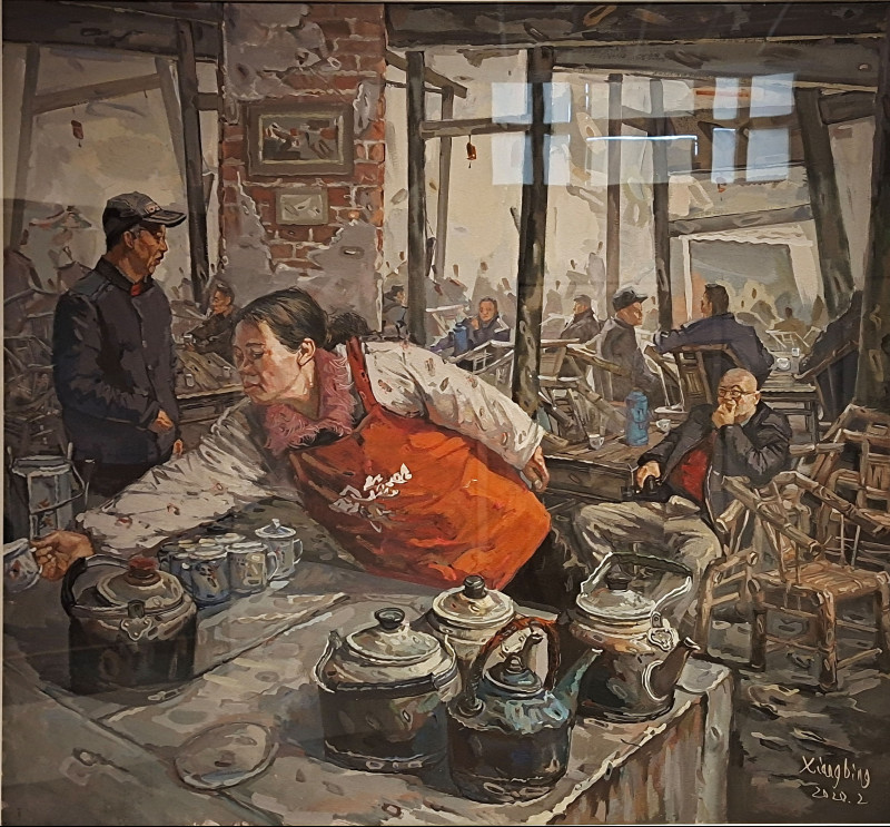 李向兵作品《茶馆·西施2》(水彩)以独特的个人创作风格延续了其系列创作“茶馆“主题,并从新的视角“再现”了现代茶馆风情。画面场景生动,主体形象突出,色调明快高雅,呈现出浓浓的市井生活气息。