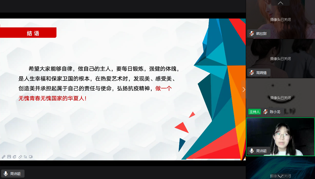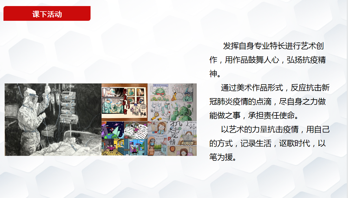 本次线上微团课比赛是丰富美院学生在校生活的一项重要活动,为学生提供了展示自我及表达心声的平台。学生们坚信只要大家同心所向、坚定信心、守望相助、共克时艰,必将迎来暖阳遍地,春暖花开。