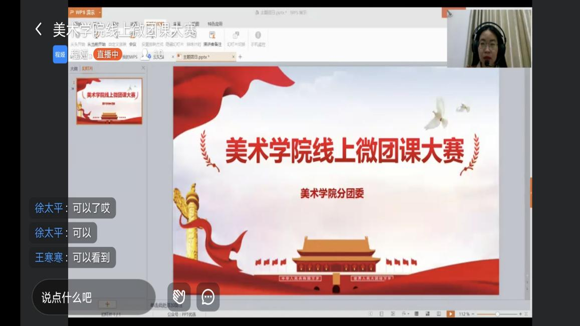 为深入学习贯彻习近平新时代中国特色社会主义思想特别是习近平总书记关于青年工作的重要思想,激励广大团员青年担当作为,展示青春风采,丰富美术学院学生疫情期间在校生活,引导学生关注社会热点话题,传递社会正能量,美术学院于4月9日晚举办了线上微团课大赛。美术学院分团委负责人程娅、21级辅导员赵玲娜、20名选手及部分观众参加了本次线上微团课比赛。