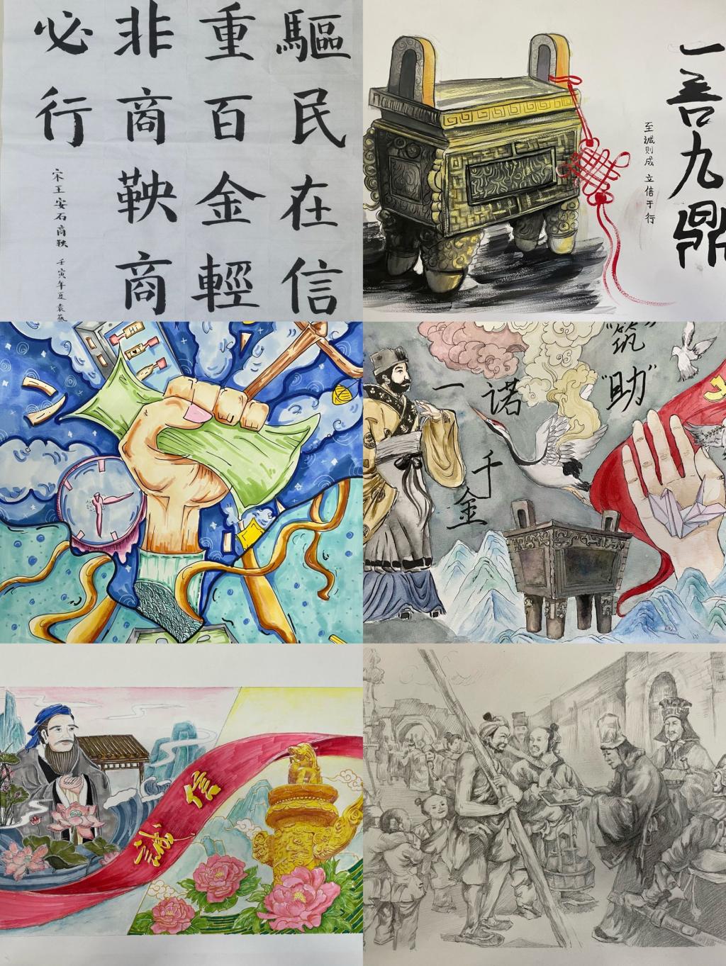 书画传声,至信至美。5月12日-5月31日,美术学院围绕“至诚则成,立信于行”主题,进行诚信书画作品征集活动,鼓励借助书法、绘画、剪纸等艺术手法,以中国共产党百年历史、中华优秀传统文化及新时代涌现出的诚信人物、故事、宣传标语、名言名句等为素材,积极创造书画作品。活动发布后,同学们积极投稿,他们将自己身边的诚信故事展现出来,体现着诚信就在身边。