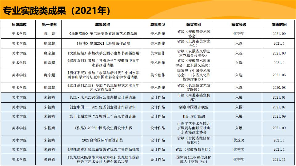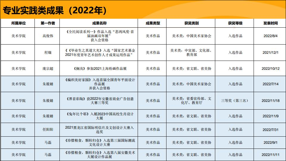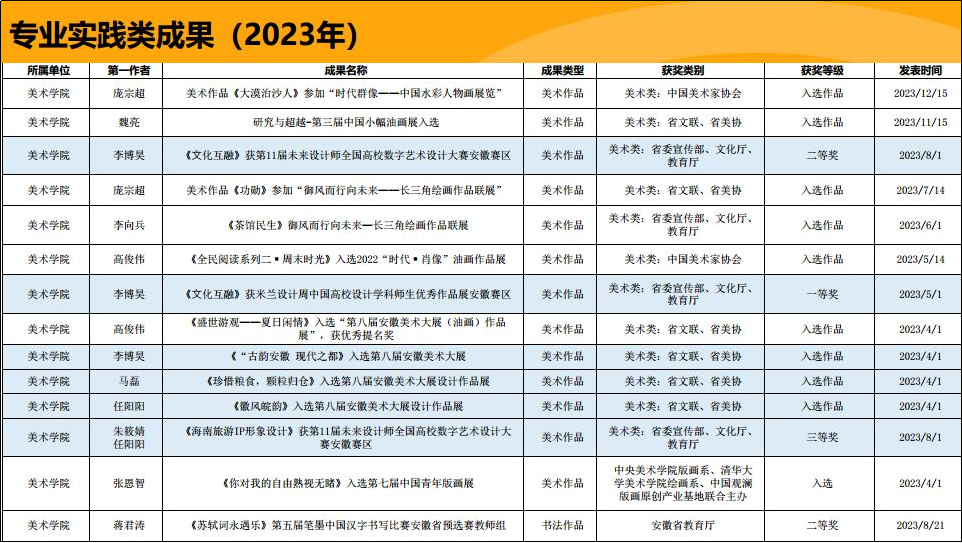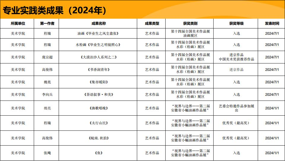 教师实践业绩实现突破:2024年度,我院五位教师六幅作品成功入选由文化和旅游部主办的第十四届全国美术作品展览(国家级权威展事/五年一届),绘画作品入选数量位居安徽省高校首位,其中两件作品斩获“进京作品”资格(含中国美术奖获奖推荐作品一件,系安徽省唯一获此殊荣作品),创下学院在国家级艺术展览中的历史最佳成绩。