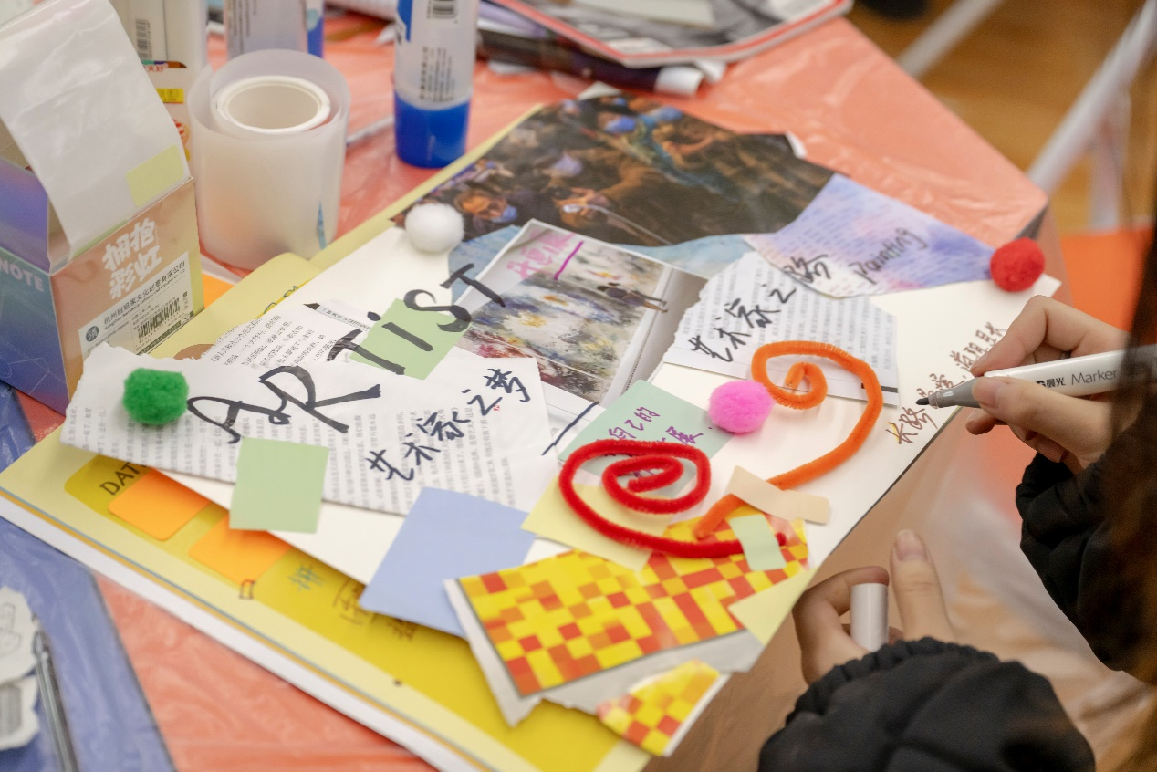 工作室为主题创作环节准备了丰富物料,废旧杂志、毛线、布料等多元素材,搭配剪刀、各色卡纸等工具,为参与者提供充足的创作空间。张翰文提出“我的情绪地图”与“我期待的生活模样”两大开放主题,引导大家通过颜色搭配、图案组合、空间布局,将抽象的情绪波动与生活渴望转化为可视化画面。创作过程中,参与者专注于裁剪、拼接的指尖动作,在纸张的拆分与重组间释放压力,在素材的筛选与取舍中梳理思绪,原本零散的纸片逐渐凝聚成承载个人故事的独特作品。
