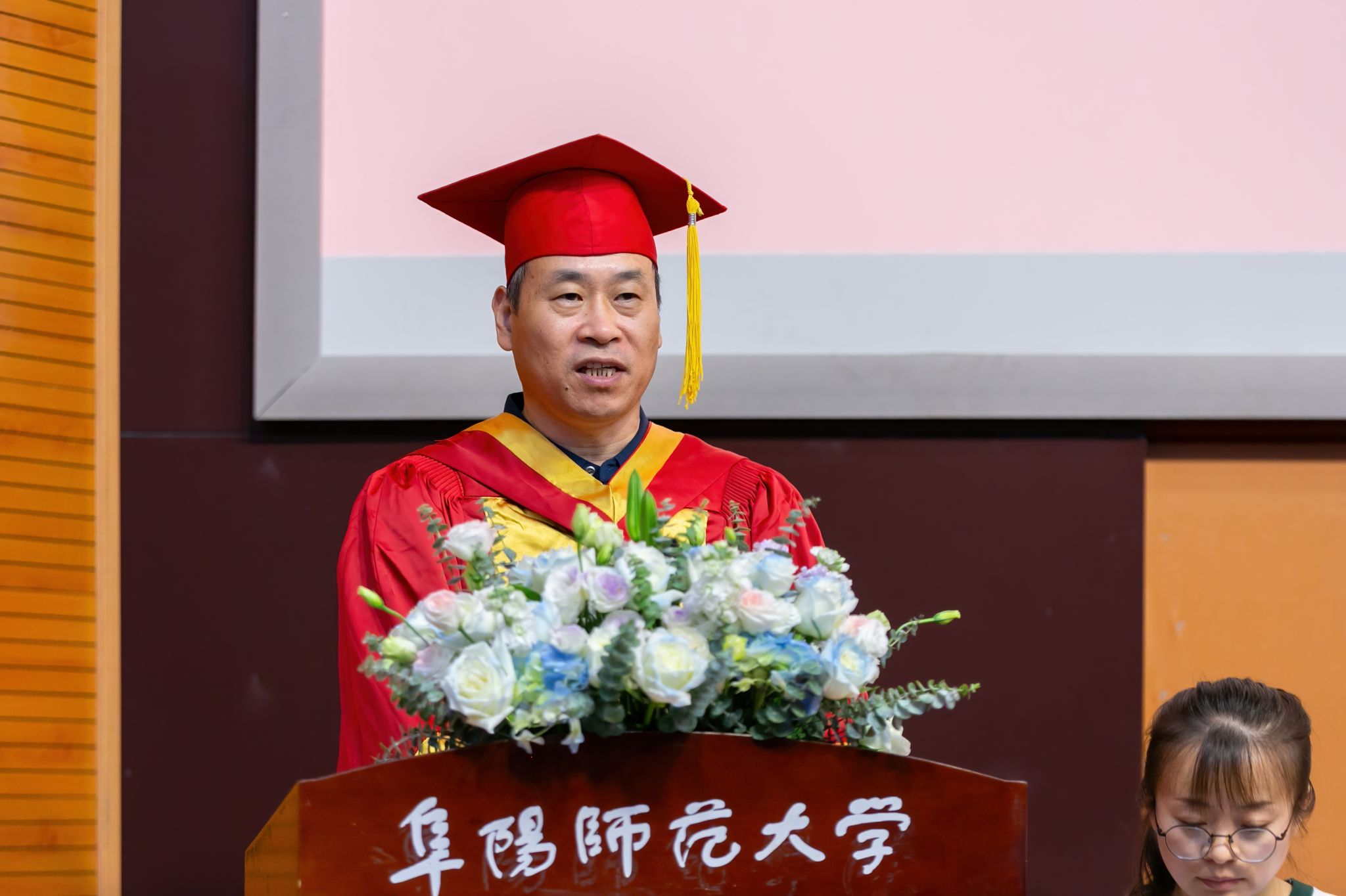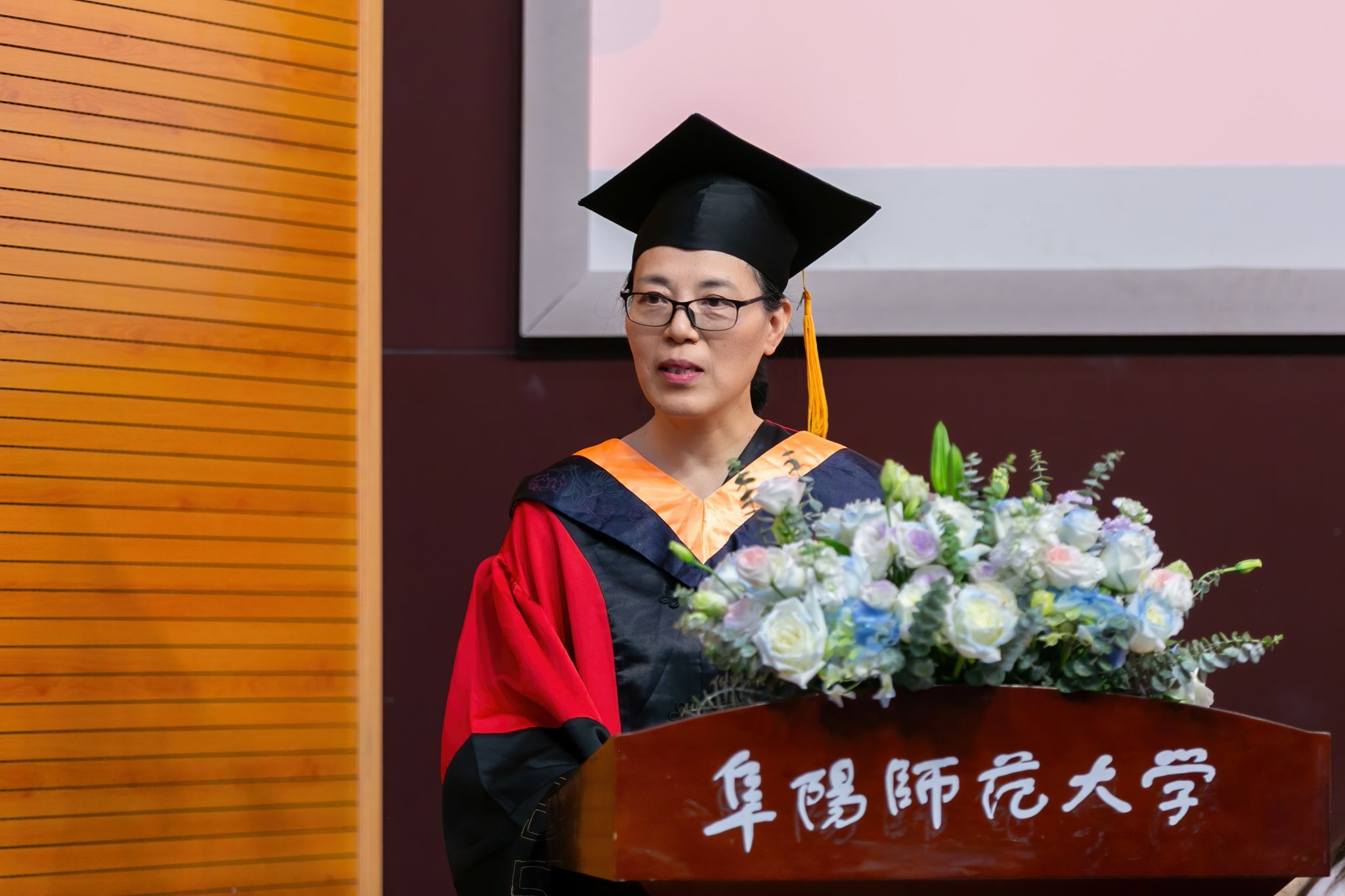 教师代表、美术学教研室程芙蓉教授以“成长见证者”身份寄语毕业生。她回顾学子四年从青涩到自信的蜕变,赞其以“求知目光”与“青春笑颜”点亮美院。临别赠言四重嘱托:一以担当为帆,传承艺术、复兴文化;二以珍惜为锚,珍视当下、踏实前行;三以乐观为盾,直面挑战、专注行动;四以初心为灯,铭记院训“志道游艺,尽善尽美”,让善美成为信仰。最后以“海阔天高”作结,祝愿毕业生前程似锦,繁花相随。