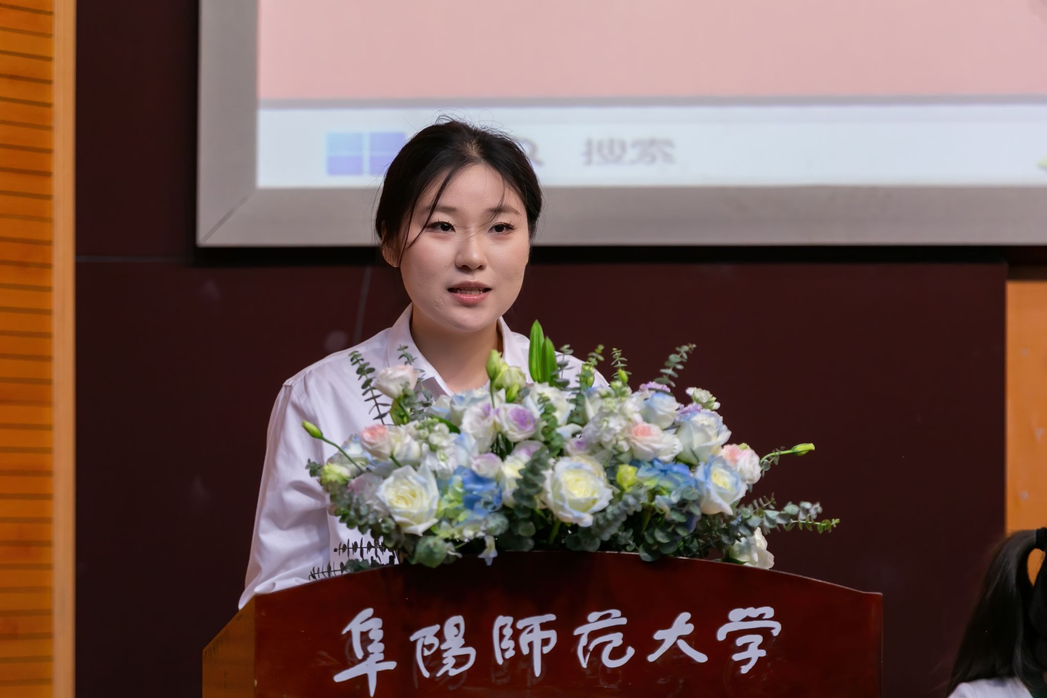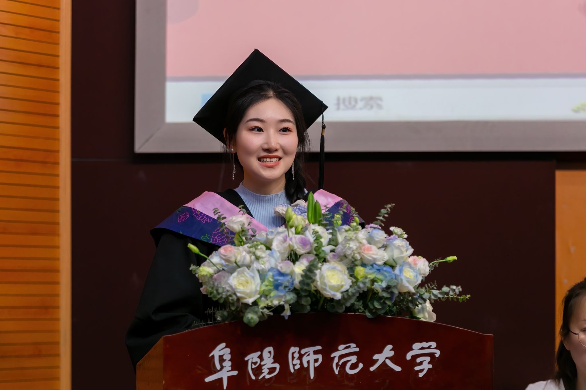 毕业生代表、2021级视觉传达设计3班金瑶同学以“时光见证身份致辞。她将四年校园比作“成长画卷”,从初入校的憧憬、同窗相伴的温暖,到抢课、占座的琐碎日常,感慨“平凡皆为青春印记”。毕业是“学士帽穗拨动”的仪式,更是奔赴五湖四海的起点,无论深造、创业或职场逐梦,美院“志道游艺,尽善尽美”的院训将永驻心间。她以“轻装策马,心向青云”寄语同窗:愿做追梦人,以行动绘就华章;愿所行皆坦途,所遇皆暖光。