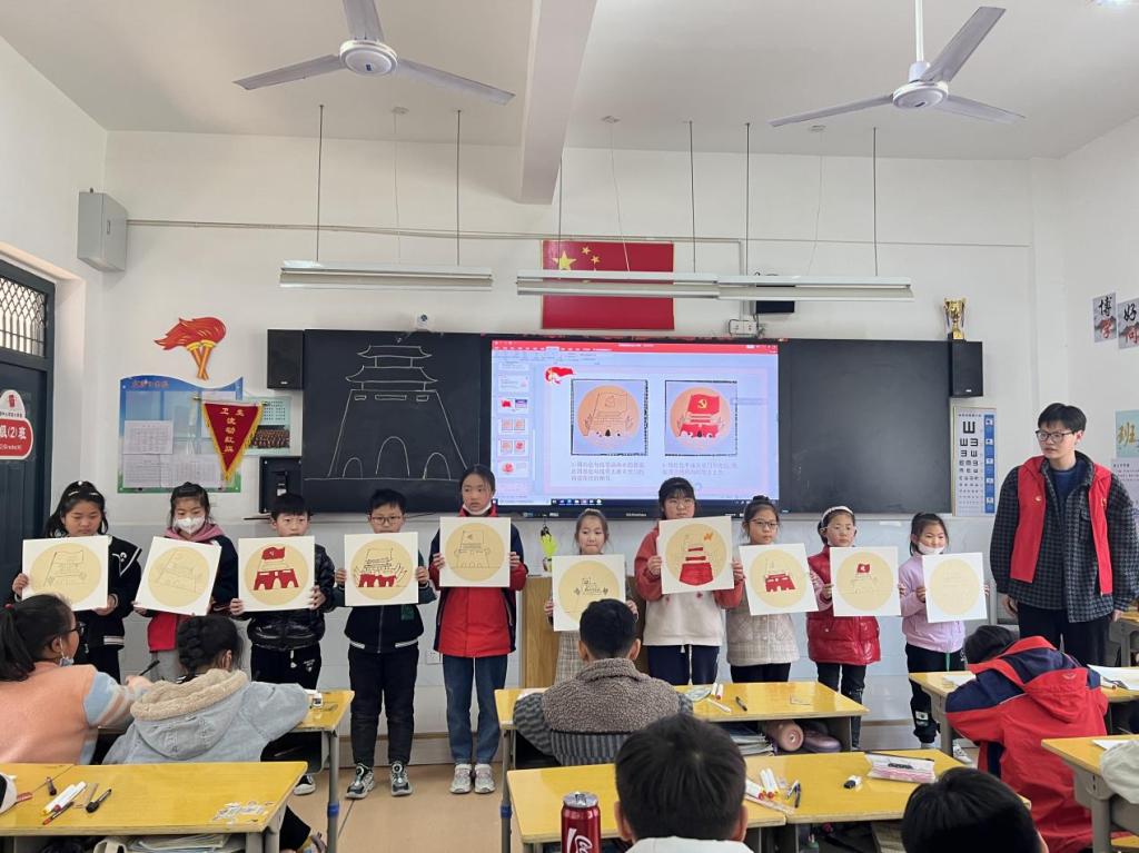 美术学院2020级美术学(师范)1班班长曾志豪以《雷锋精神我传承》为主题为颍上县慎城镇中心小学四年级2班的学生上了一节美术课。课程以问题抢答与视频形式让学生了解什么是雷锋精神,随后让学生以小组讨论的形式思考作为小学生该如何践行雷锋精神,教育引导学生以雷锋为榜样,做到乐于助人、热爱祖国。在课堂上,学院团委为同学们准备了画材,曾志豪以天安门、党旗为元素指导学生创作一幅作品。美术课课堂氛围活跃,学生较为积极,作品创作较为投入。