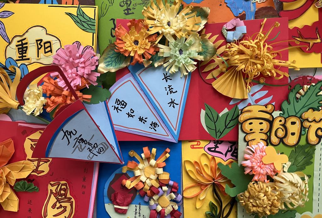 活动期间,每一组同学都充分发挥自己的动手能力和奇思妙想,紧扣“重阳”这一主题进行创作,互相帮助、互相鼓励,最终在合作中呈现出一份份精彩的作品,无论是高雅纯净的菊花,还是温暖和煦的红日,都跃然纸上。学生们还在贺卡中写下了有关重阳的小诗,回望历史体会文人心境,与其产生共鸣。