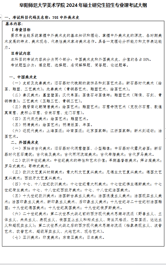 阜阳师范大学美术学院2024年硕士研究生招生专业课考试大纲