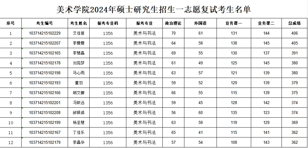 美术学院2024年硕士研究生招生一志愿复试考生名单: