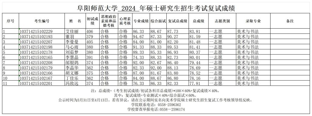 阜阳师范大学美术学院2024年硕士研究生招生考试一志愿复试成绩公示