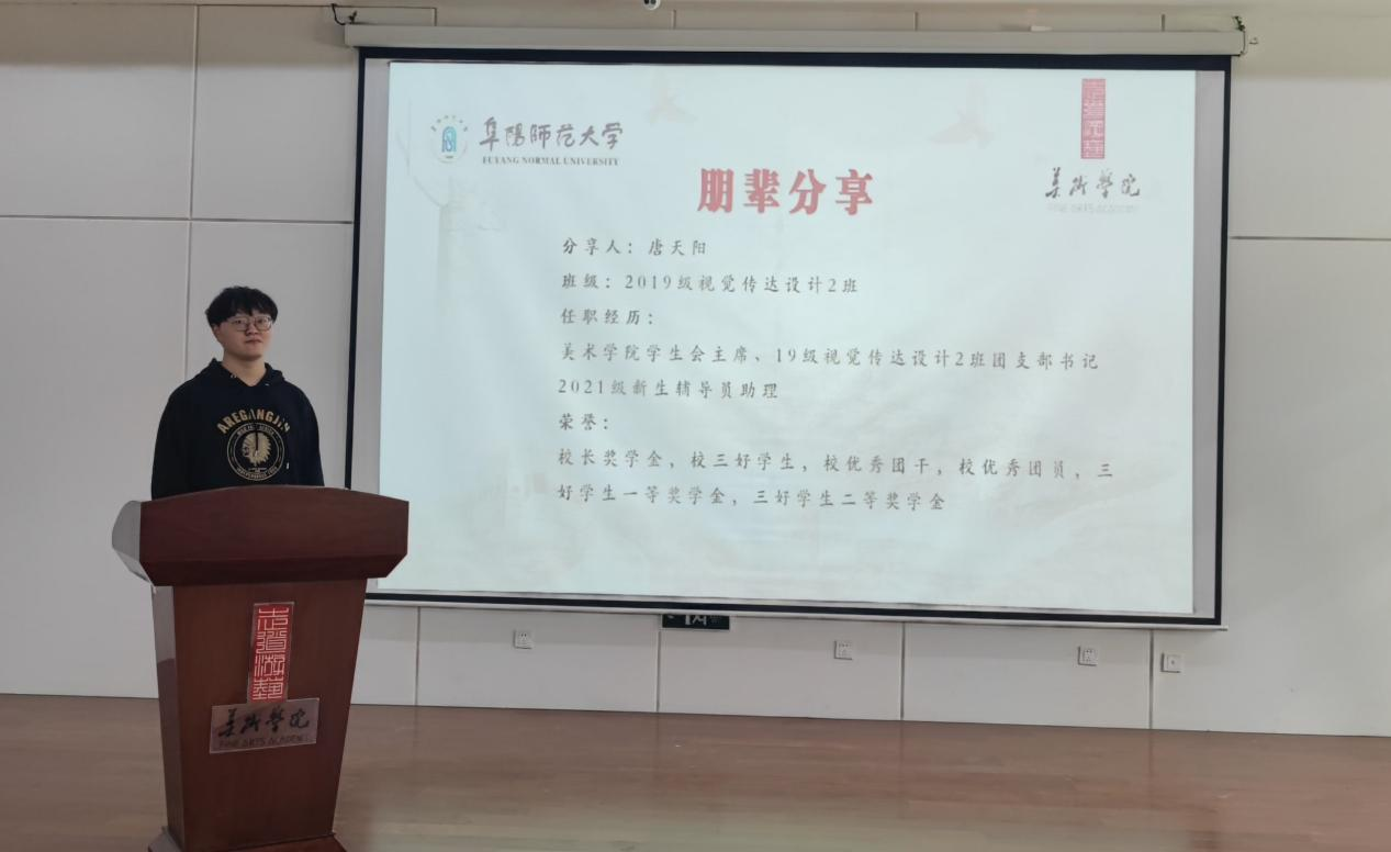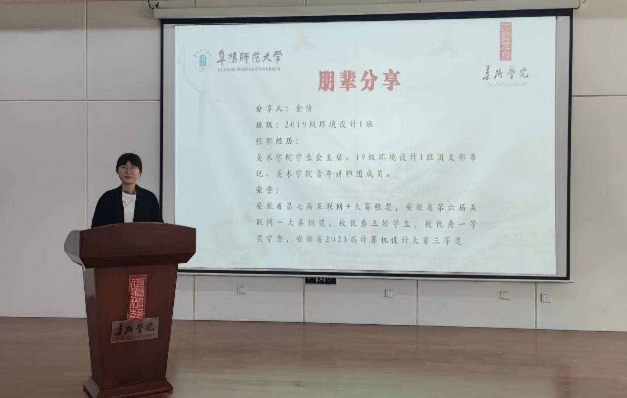 程娅与参会学生共同学习了习近平总书记在中国人民大学考察时的重要讲话精神,程娅指出:新时代中国青年敢担当、能担当、善担当,不畏困难、奋勇争先,脚踏实地,希望所有同学谨记习近平总书记“用脚步丈量祖国大地,用眼睛发现中国精神,用耳朵倾听人民呼声,用内心感应时代脉搏”的谆谆教诲,成为一名优秀的新时代青年。随后,2019级环境设计1班金倩、2019级视觉传达设计2班唐天阳在“朋辈分享”环节,从学生工作、学习、竞赛、志愿服务等方面与在场同学进行了经验交流。