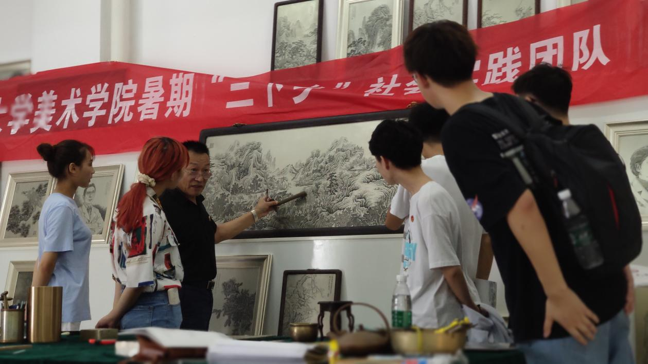 为深入学习宣传贯彻习近平新时代中国特色社会主义思想,贯彻落实习近平总书记关于青年工作的重要思想,引导和帮助广大青年学生上好与现实相结合的“大思政课”,在社会课堂中受教育、长才干、作贡献,在观察实践中学党史、强信念、跟党走,通过社会实践坚定理想信念、站稳人民立场、练就过硬本领、投身强国伟业,努力成为担当民族复兴大任的时代新人,以实际行动庆祝中国共产党成立100周年,增强学生的专业认同感、责任感、使命感,美术学院结合专业特点,组织学生志愿者前往阜阳市非物质文化遗产——杜氏刻铜工作中心进行调研,开展暑期“三下乡”社会实践活动。