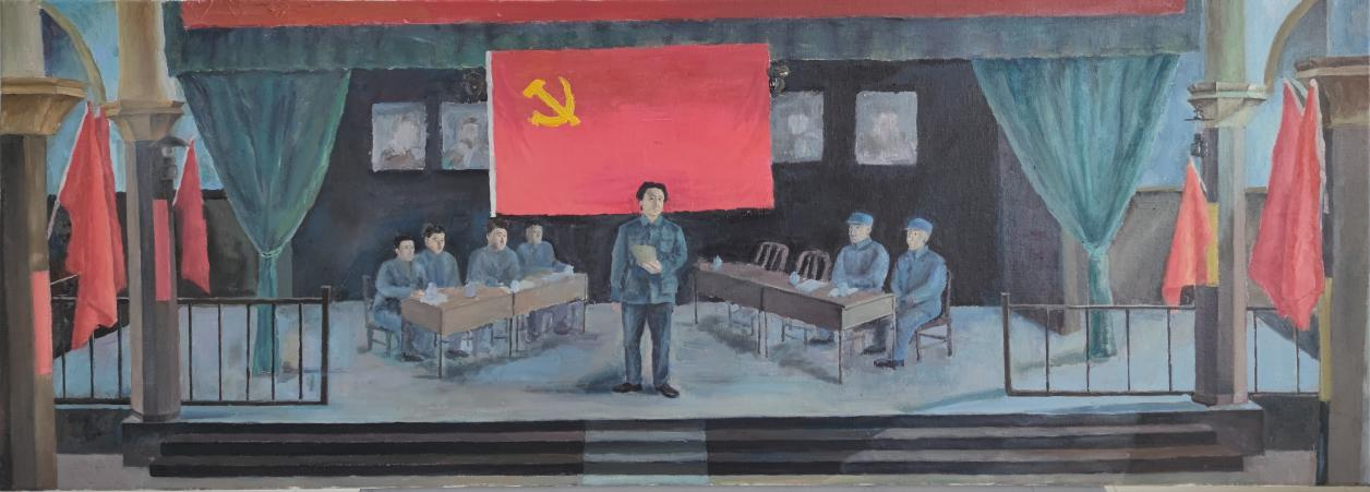 2019级美术学2班团支部的作品《中共六届六中全会》描绘的是1938年党的六届六中全会在延安胜利召开的情景。画面中,冬日的阳光洒在彩窗上,宽敞明亮的教堂内,主席台正中悬挂着鲜艳的中国共产党党旗。党的领导人端坐在党旗两侧,聆听毛泽东同志作《论新阶段》的政治报告,庄严而又宁静。四周柱子上的红旗,在阳光的映照下显得格外鲜明,仿佛预示着在党的领导下中国光明的未来。该支部以此画作用来铭记党的百年光辉历史,勉励所有同学不忘历史,砥砺奋进。