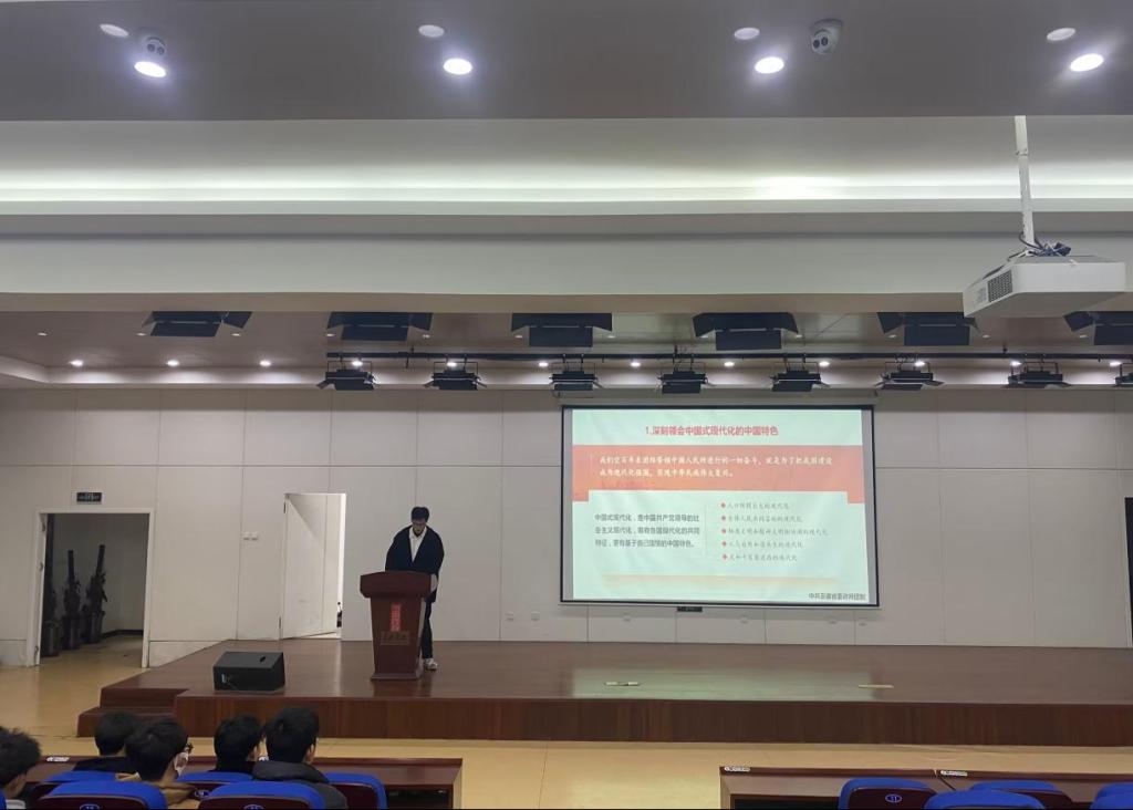 两位同学从“深刻领会党的二十大的重大意义”“准确把握党的二十大精神实质”“青年担当”等三个方面对党的二十大精神进行了阐释。同时指出,作为青年大学生,要凝聚思想共识,充分认识学习宣传贯彻党的二十大精神的重大意义,立志做有理想、敢担当、能吃苦、肯奋斗的新时代好青年,在中国式现代化进程中贡献青春力量。