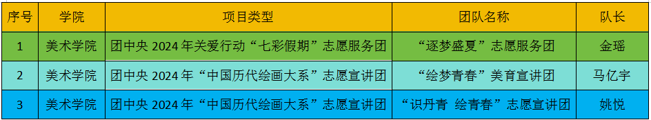 近日,团中央公布了2024年关爱行动“七彩假期”志愿服务团、2024年“中国历代绘画大系”志愿宣讲团入选团队名单,我院3支队伍成功入选其中。