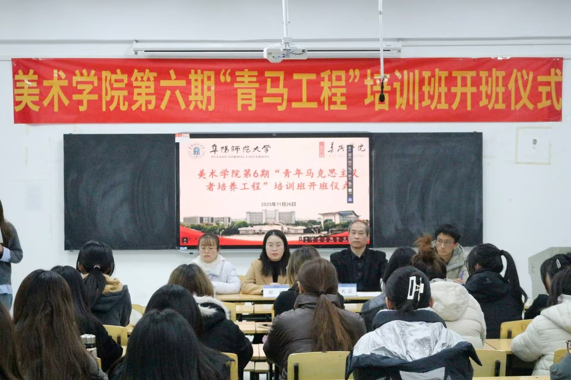 为深入学习贯彻党的二十届四中全会精神,以及习近平总书记关于青年工作的重要思想,扎实推进团中央学校部倡导的青年马克思主义者培养工程,着力培养一批坚定的青年马克思主义信仰者、学习者、传播者,加强学院共青团基层组织建设,发挥学院各级团学骨干在学生中的积极作用,拓宽学院育人途径,美术学院于11月26日在汉风C楼304举办了第6期“青马工程”培训班开班仪式。美术学院党委书记曹礼品、学院团委负责人张恩智、各年级辅导员及全体青马班学员参加了开班仪式。