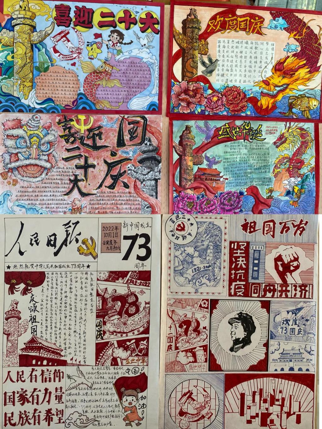 喜迎国庆手抄报大赛。国庆期间,为体现学生的专业特长,发挥学生的专业优势为祖国庆生,以实际行动迎接党的二十大胜利召开,美术学院举办了以“喜迎国庆节 献礼二十大”为主题的手抄报大赛。同学们用手中的画笔描绘出对祖国的祝福,对党的二十大胜利召开的期盼。本次手抄报大赛,为同学们提供了展示专业特长的平台,激发了同学们的爱国之情和民族自豪感。同学们参与度较高,共收到了全院在校学生的195份作品,并择优进行了展出。