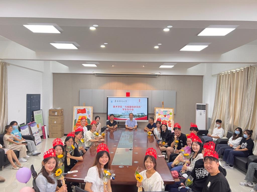 “与祖国母亲共庆生”学生集体生日会。10月1日上午,美术学院为17名在国庆期间过生日的同学举办集体生日会。美术学院党委书记曹礼品、副院长(主持工作)魏亮、党委副书记李向兵、副院长肖玮及各年级辅导员参加了生日会,为17位同学送上生日祝福。生日会上,学院为小寿星们准备了鲜花、蛋糕等生日惊喜,学院领导及辅导员们在现场亲手为同学们写上生日祝福。“与祖国母亲共庆生”生日会激发了同学们的爱国之情,使同学们在特殊时期感受到学院的人文关怀。2020级环境设计2班的李慧表示:我很荣幸与祖国母亲共同庆生,感谢学院领导、老师以及幕后工作的同学们为我们准备的惊喜。与大家共同度过这个生日,感觉很开心很难忘。生日会让我感觉到学校不只有学习,还有同学与老师们彼此在生活中相互给予的温暖,很感谢大家的付出,同时祝福伟大的祖国母亲生日快乐,永远繁荣昌盛!