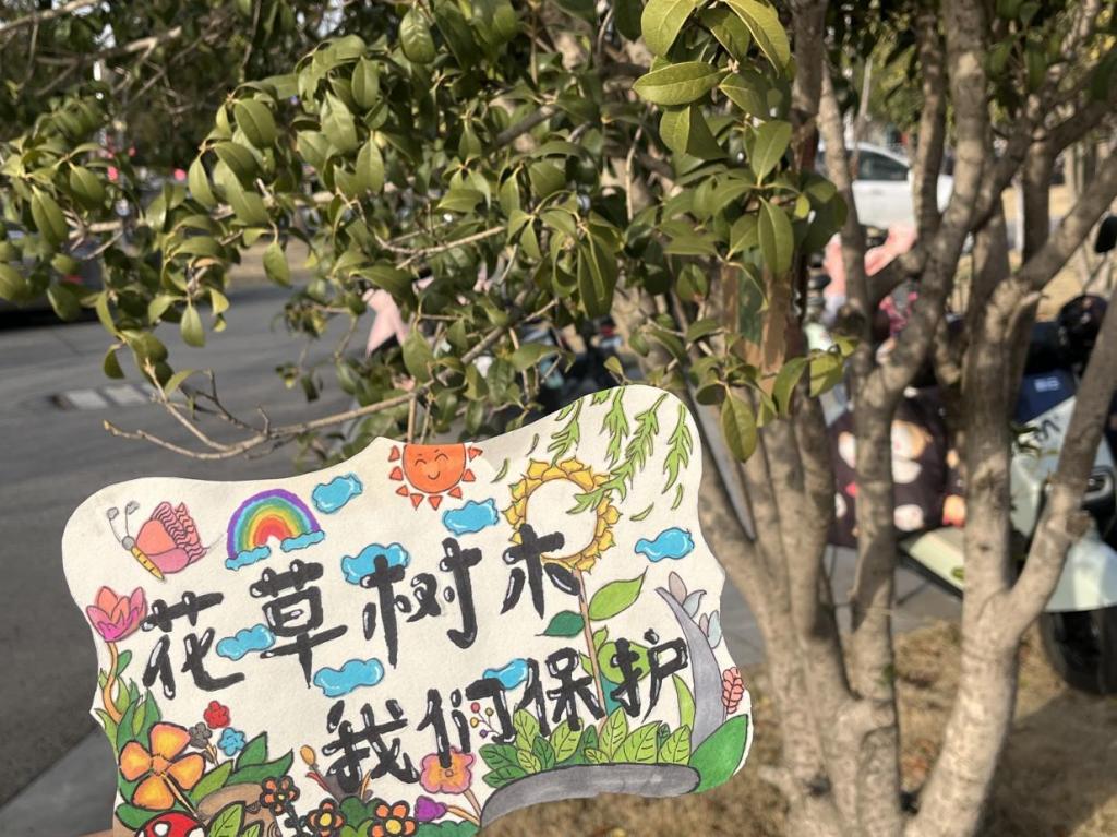 同学们在制作宣传牌的过程中进行了巧妙的构思,通过醒目的颜色和图形对比、简洁明了的“爱护花草,从我做起”“花草有生命,脚下请留情”的宣传语传递“爱绿”“护绿”的立意,呼吁全体师生共同创建、维护美丽校园。