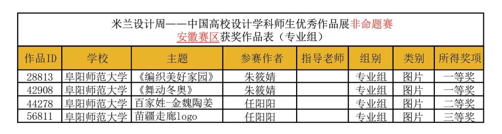 近日,第六届“米兰设计周——高校设计学科师生优秀作品展”非命题赛专业组省赛评审工作已经落下帷幕。经过作品筛查、专家评审团初评、终评等环节,分别评选出省赛一二三等奖。美术学院教师朱筱婧的《编织美好家园》《舞动冬奥》两件作品获安徽赛区一等奖,任阳阳老师的《百家姓-金魏陶姜》《苗疆走廊logo》两件作品获安徽赛区三等奖。据悉,省赛获奖作品将参加全国总决赛角逐全国奖项。
