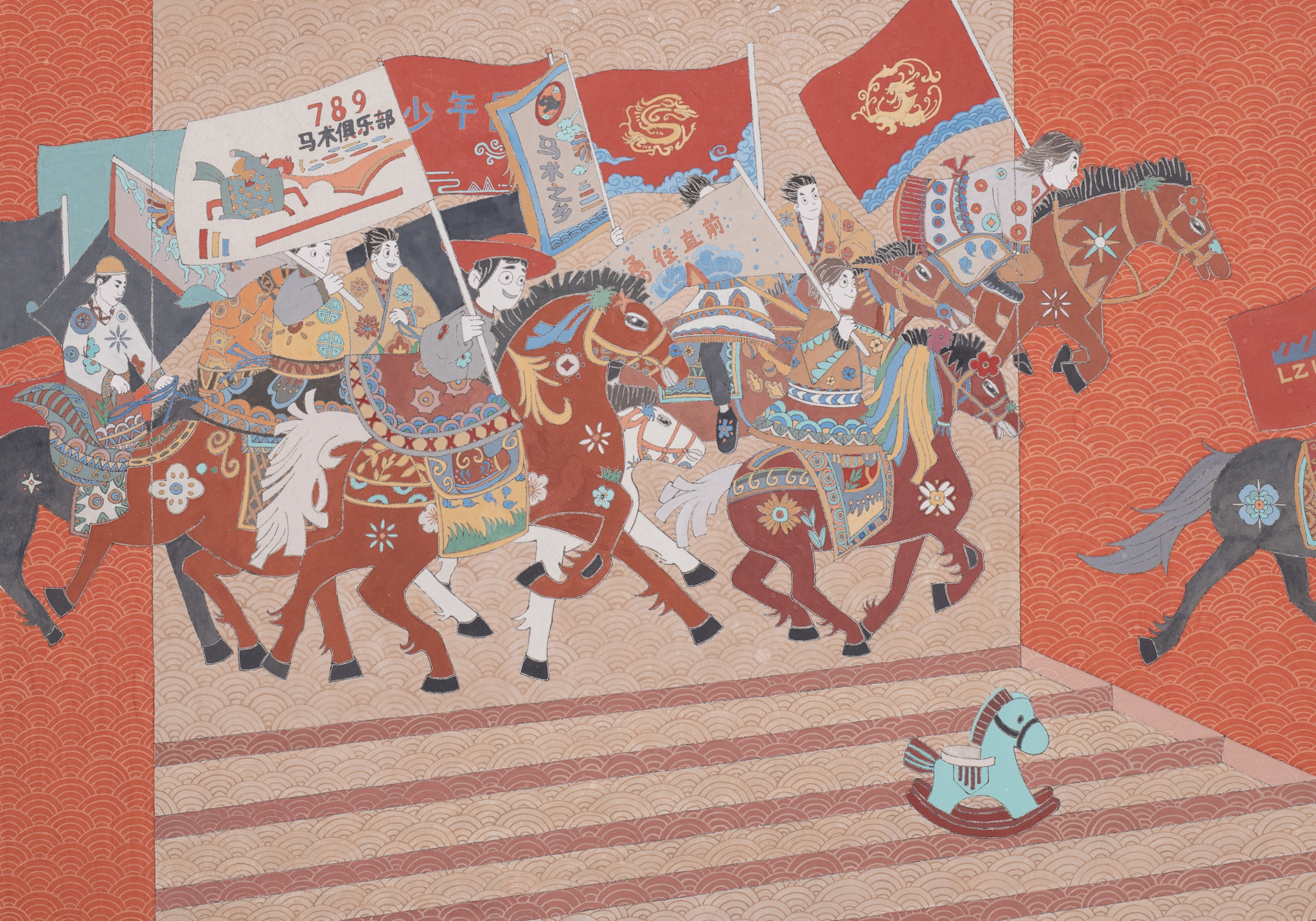 《跃马新乡韵》以民间美术装饰技法构绘,浓艳色调、图案化造型赋予群马奔腾强烈视觉张力。旗帜上“马术之乡”锚定乡土根脉,“少年”“俱乐部”折射文化传承的现代转型,前景木马勾连代际记忆。骏马矫姿暗合乡村振兴奋进精神,借马术切片串联传统民俗与时代发展,在乡土绘画语境中实现技法传承与观念突破,生动照见文化活化的时代图景 。