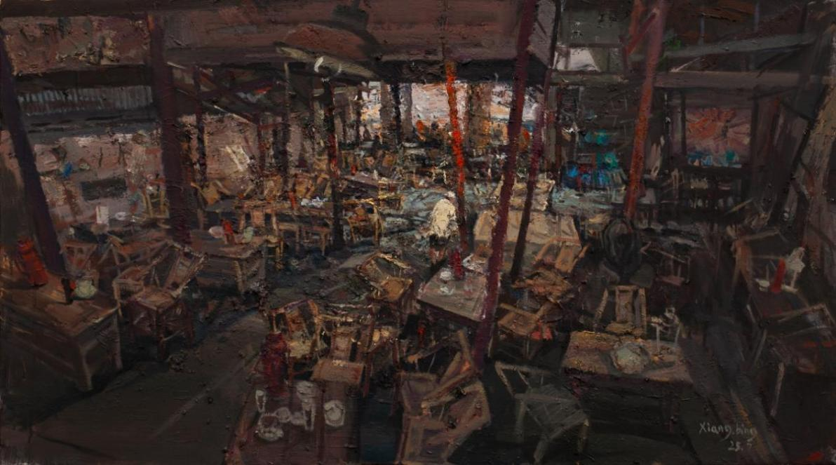 李向兵的油画《茶语叙事·暖》以质朴温暖的老茶馆场景为画面主体,通过茶具、桌椅与光影的细腻刻画,隐喻君子之交淡如水、清茶一杯见廉心的文化意象。画面以含蓄质朴的笔触,勾勒出平凡物象“俭以养德”的精神图景;暖壶、茶盏与竹木桌椅,构成静谧而充满张力的视觉叙事。作品展现了对清廉品格的追求传递出淡泊明志、清净自守的东方生活美学,蕴含深厚的伦理温度与文化自觉。
