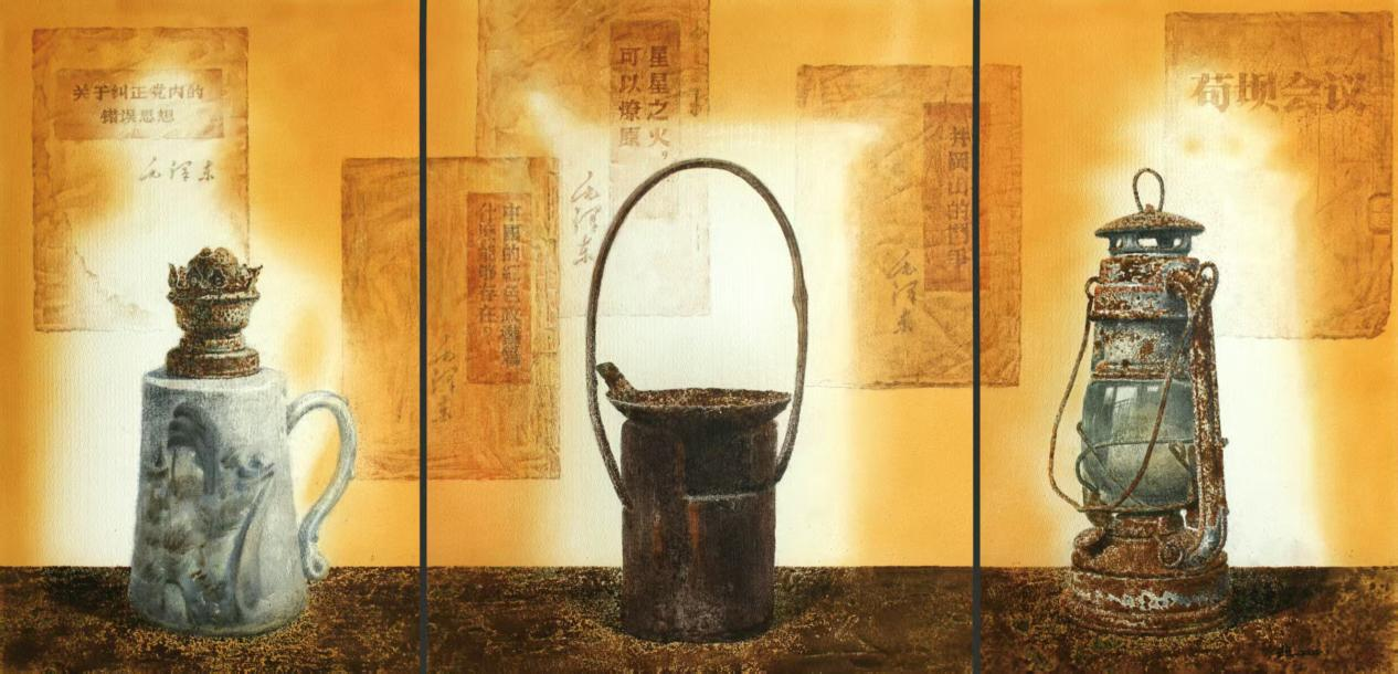 庞宗超的水彩作品《星火长明》则以毛泽东同志在不同革命历史时期使用过的煤油灯、青瓷灯与马灯为视觉线索,串联起一段段光辉历程。画面以暖黄旧纸文献为底,既点明历史语境,也强化了精神传承的意象。作品在艺术语言上注重材质与意蕴的统一,竹筒灯的朴拙、青瓷灯的温润与马灯的斑驳,呼应了革命历程不同阶段的环境特征;三联式构图庄重稳定,光影层次丰富,在虚实交织中传递出信仰的延续性。该作以物载史、小中见大,将革命精神凝聚于不灭的“星火”意象之中,赋予廉洁文化深厚的历史纵深与精神重量,体现出深远的纪念价值与教育意义。