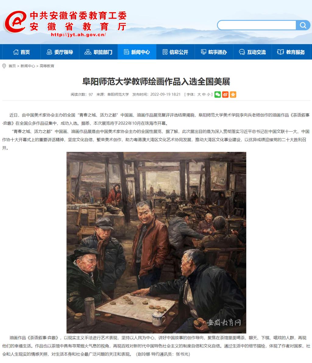 9月19日,安徽教育网报道:阜阳师范大学教师绘画作品入选全国美展。文章地址:http://jyt.ah.gov.cn/xwzx/gdjy/40599532.html