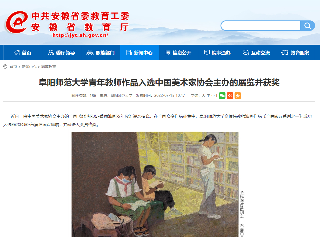 7月15日,安徽教育网报道:阜阳师范大学青年教师作品入选中国美术家协会主办的展览并获奖。文章地址:http://jyt.ah.gov.cn/xwzx/gdjy/40581291.html
