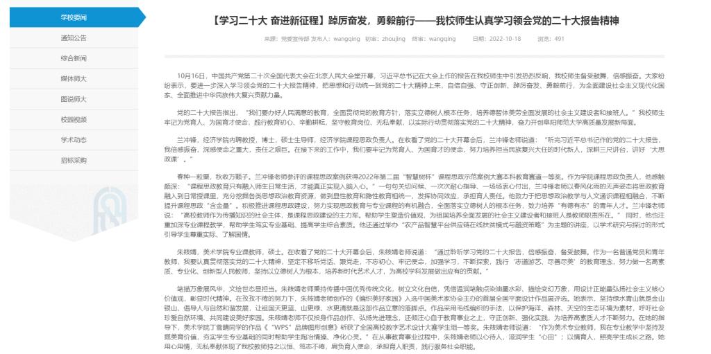 10月18日,阜阳师范大学官网学校要闻版报道我院教师朱筱婧学习领会党的二十大精神的心得。文章地址:http://www.fynu.edu.cn/info/1052/51424.htm