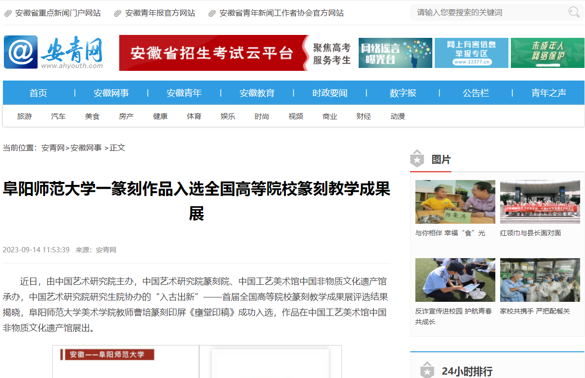 9月14日,安青网报道:阜阳师范大学一篆刻作品入选全国高等院校篆刻教学成果展。文章地址:https://www.ahyouth.com/news/20230914/1711992.shtml