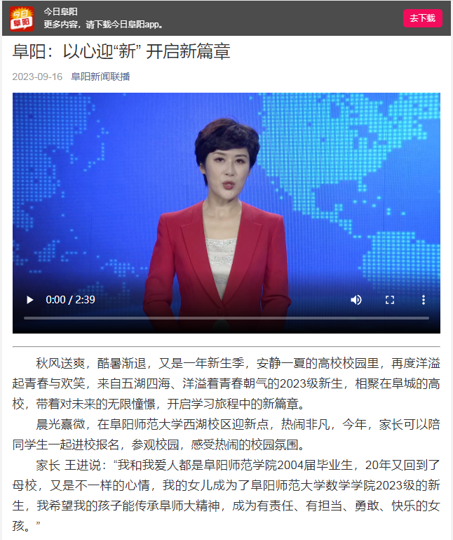 9月16日,阜阳新闻联播报道:阜阳师范大学一篆刻作品入选全国高等院校篆刻教学成果展。文章地址:https://wxfx.fyosys.com/mag/info/v1/info/wapInfoView?id=304013&themecolor=f30c5c&p_u=778