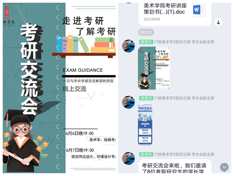 为进一步帮助同学们明确考研目标,增强考研信心,做到科学决策,美术学院于6月7日、8日晚针对不同专业举办了两场考研经验交流会,邀请视觉传达设计、环境设计、绘画和美术学四个专业考研成功的8位学长学姐为低年...