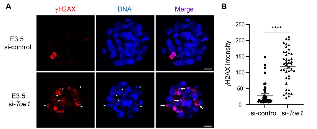 阜阳师范大学刘勇教授课题组通过实时荧光定量PCR和免疫荧光发现Toe1在小鼠合子基因组激活(ZGA)之后开始转录,在8-细胞和桑葚胚mRNA丰度最高。利用RNA干扰和显微注射技术沉默TOE1表达,发现TOE1缺失导致小鼠胚胎发育停滞在晚期桑葚/早期囊胚期。mRNA挽救实验进一步证实了TOE1缺失与胚胎发育阻滞的因果关系。研究发现,在胚胎阻滞前期TOE1缺失减少了卵裂球增殖,而在阻滞后期TOE1缺失增加了细胞凋亡信号。在分子水平上,TOE1缺失上调了p21、p53、Sp1等细胞增殖和凋亡相关基因的转录水平。进一步研究发现,TOE1缺失引起了大量的DNA损伤。机体为了修复DNA损伤,阻止了细胞周期的进展,然而未能修复的DNA损伤则会引起细胞凋亡。该研究表明,TOE1对于维持小鼠早期胚胎的基因组完整性至关重要。