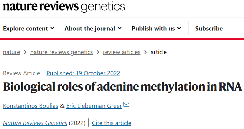 2022年10月19日,波士顿儿童医院 Eric Lieberman Greer在Nature Reviews Genetics 杂志在线发表题为“Biological roles of adenine methylation in RNA”的综述文章,这篇综述探讨了最新研究揭示m6A修饰的RNA在染色质结构,转录调控和基因组稳定性中的作用,此外,还总结了m6A在干细胞更新等生物学过程中的作用。
