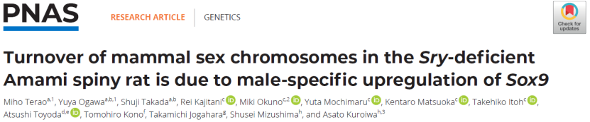 1. Terao M,. Turnover of mammal sex chromosomes in the Sry-deficient Amami spiny rat is due to male-specific upregulation of Sox9. Proc Natl Acad Sci U S A. 2022 Dec 6;119(49):e2211574119. doi: 10.1073/pnas.2211574119.