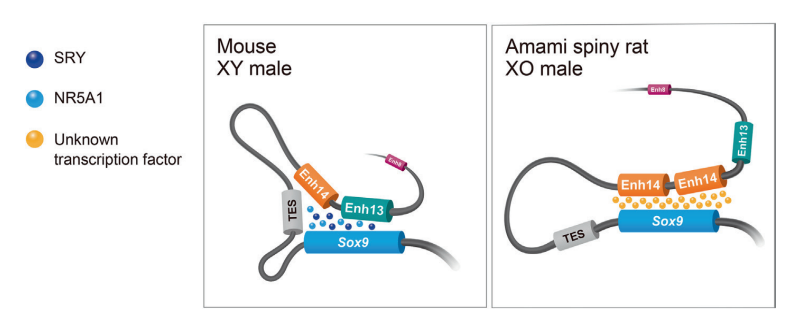 。研究人员在奄美刺鼠中发现了一段仅存在于雄性个体中的 DNA 重复序列,该重复序列位于 3 号染色体 Sox9 基因序列的上游,能在缺少 Sry 基因的情况下促进 Sox9 基因的表达,诱导睾丸形成。