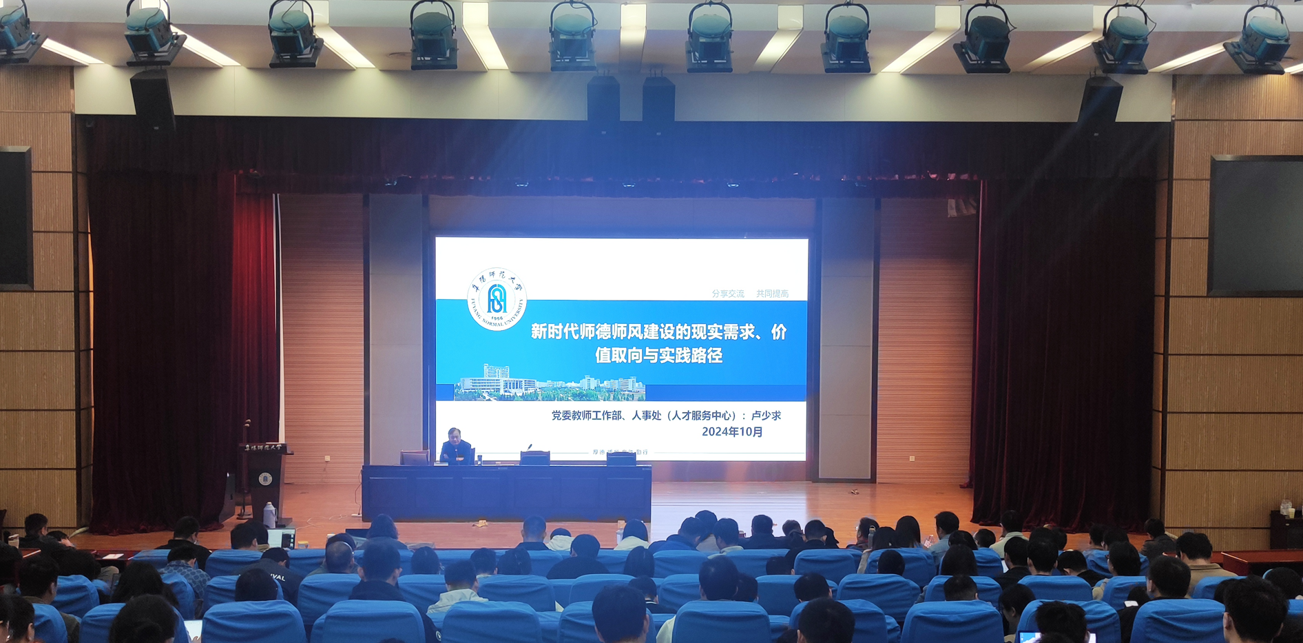 人事处(党委教师工作部)卢少求处长,首先向老师们传达学习习近平总书记近日在安徽考察时的重要讲话精神,介绍学校高层次人才教师队伍的建设历程,鼓励新进教师潜心科研和专心治学。随后,卢少求以《新时代师德师风建设的现实需求、价值取向与实践路径》为题,跨越古今中外文化元素,从为什么、是什么和怎么做三个维度,融合理论与实践两条线,为大家呈现了一场具有人文魅力、思想张力、哲学引力的师德师风建设专题教育报告。