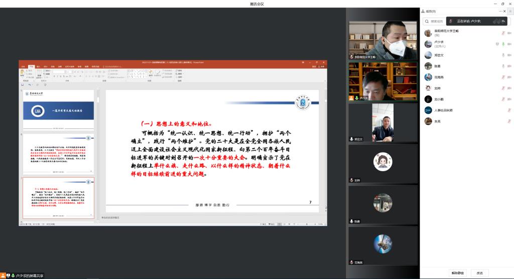 12月21日,为深入学习贯彻党的二十大精神,人事处党支部结合疫情防控实际情况,组织了“学习宣传贯彻党的二十大精神”线上专题党课,党支部值班值守人员及阳性居家办公人员全员参加党课学习。