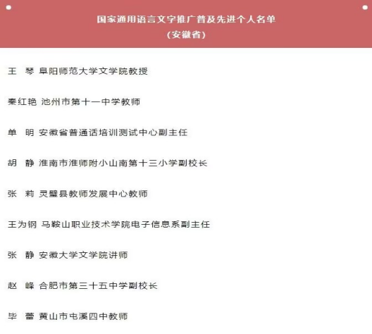 国家通用语言文字推广普及工作表彰大会暨2023年国家语委全体委员会议在京召开。我校文学院王琴教授荣获“国家通用语言文字推广普及先进个人”称号,这是国家通用语言文字法颁布实施22年来的首次表彰。学校历来重视国家通用语言文字推广普及工作,在新生普通话大赛、普通话水平测试、经典润乡土活动等方面取得了骄人成绩。特别是文学院语言学教学团队,带领高校青年志愿者团队始终坚持“推普助力脱贫攻坚”“推普助力乡村振兴”,为皖北地区国家通用语言文字的推广做出突出贡献。